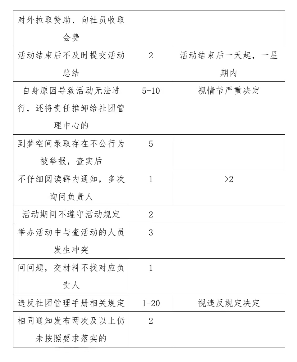 注:1.每个社团基础分为 60 分,社团低于 60 分,进入为期 35 天的考察期,考察期满低于 60 分,由共青团社团管理中心勒令解散;